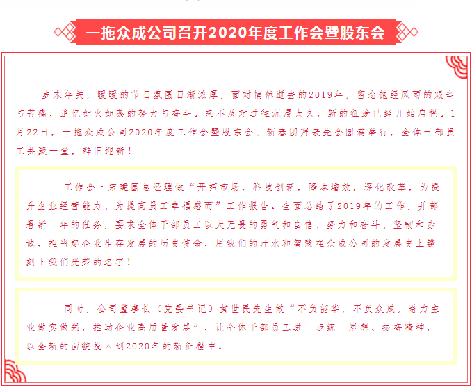 一拖眾成公司召開2020年度工作會暨股東會、新春團拜表先會